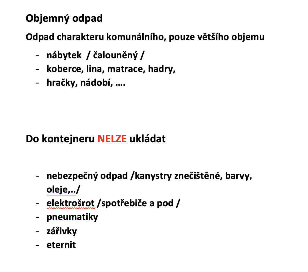 Nebezpečný odpad bude vyvezen dne 11. 10. v čase 9.15 - 9.30. Kontejner na objemný odpad bude přistaven v pátek dne 10. 10. a v průběhu víkendu bude možné do něho umisťovat objemný odpad. Více podrobností v přiložených letáčcích.